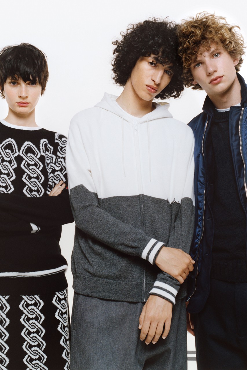 В коллекцию вошли кашемировые свитера и удлиненные платья с эффектом повреждения, вязанные костюмы с японскими узорами, футболки с принтами, двусторонние бомберы, рубашки и брюки из шерсти, а также худи и пальто.