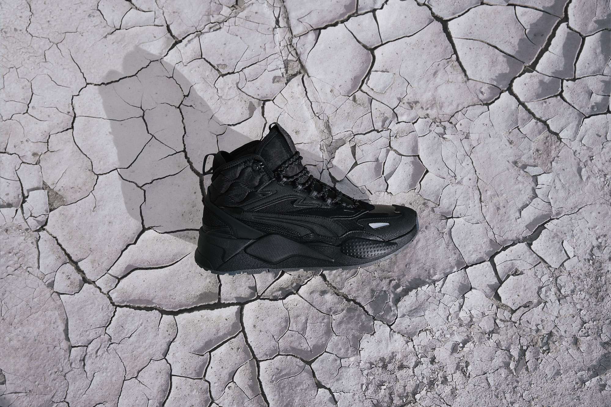 Кросівки в кампейні представлені моделлю PUMA RS-X Hi. Сітчасту основу доповнили накладкою із синтетичних матеріалів на носку, замшевою — в нижній частині та поліуретановою на п’яті, а також м’яким коміром із нейлону. Модель отримала проміжну підошву RS із легкого поліуретану та гумову нижню підошву.