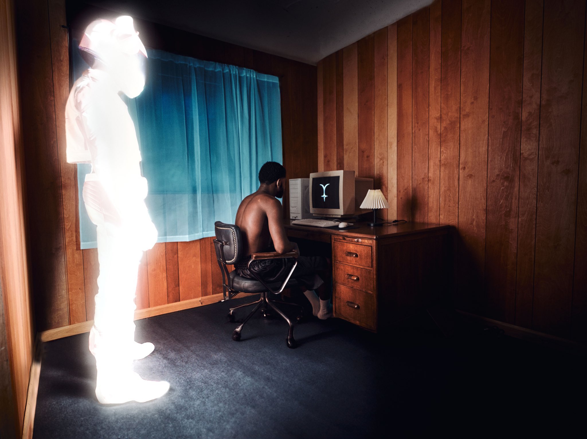 На картинці Lil Nas X сидить за старим комп’ютером та з білою фігурою за спиною, що відтворює кавер Sega Bodega 2021 року.