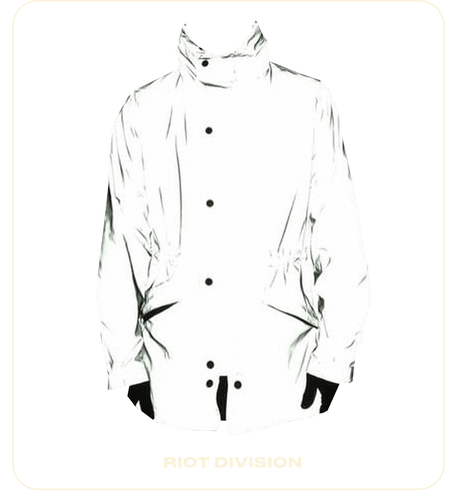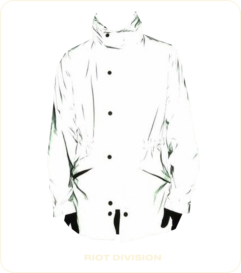 Одним з перших знакових айтемів з рефлективної тканини від українського бренду, стала куртка Reflective Wrapped Parka (2015) від RIOTDIVISION, повністю виготовлена зі світловідбивального матеріалу.