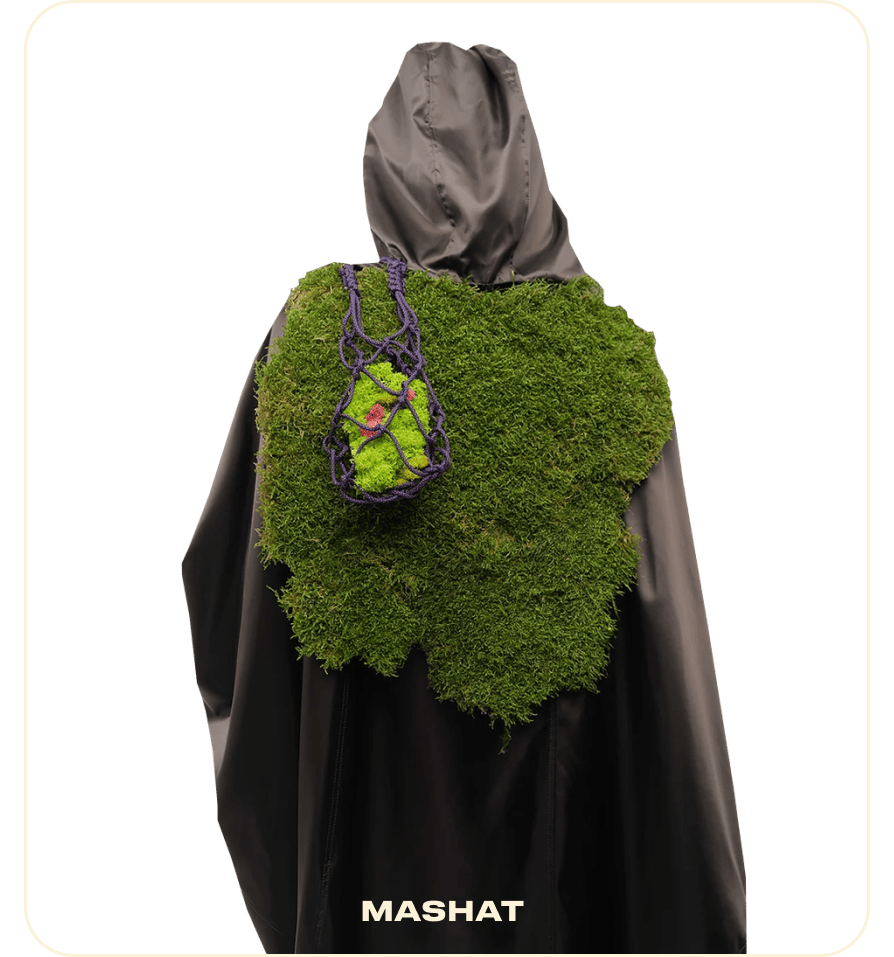 Дизайнерський квір-дует MASHAT у колекції 2023 року, створеної з органзи, паракорду та інших синтетичних тканин, використав елементи зі стабілізованого моху, серед яких, зокрема, кокетка на спині кейпу, патчі оверсайз-сумки сірого кольору з природними принтами й накладки на плечах органзового анорака.