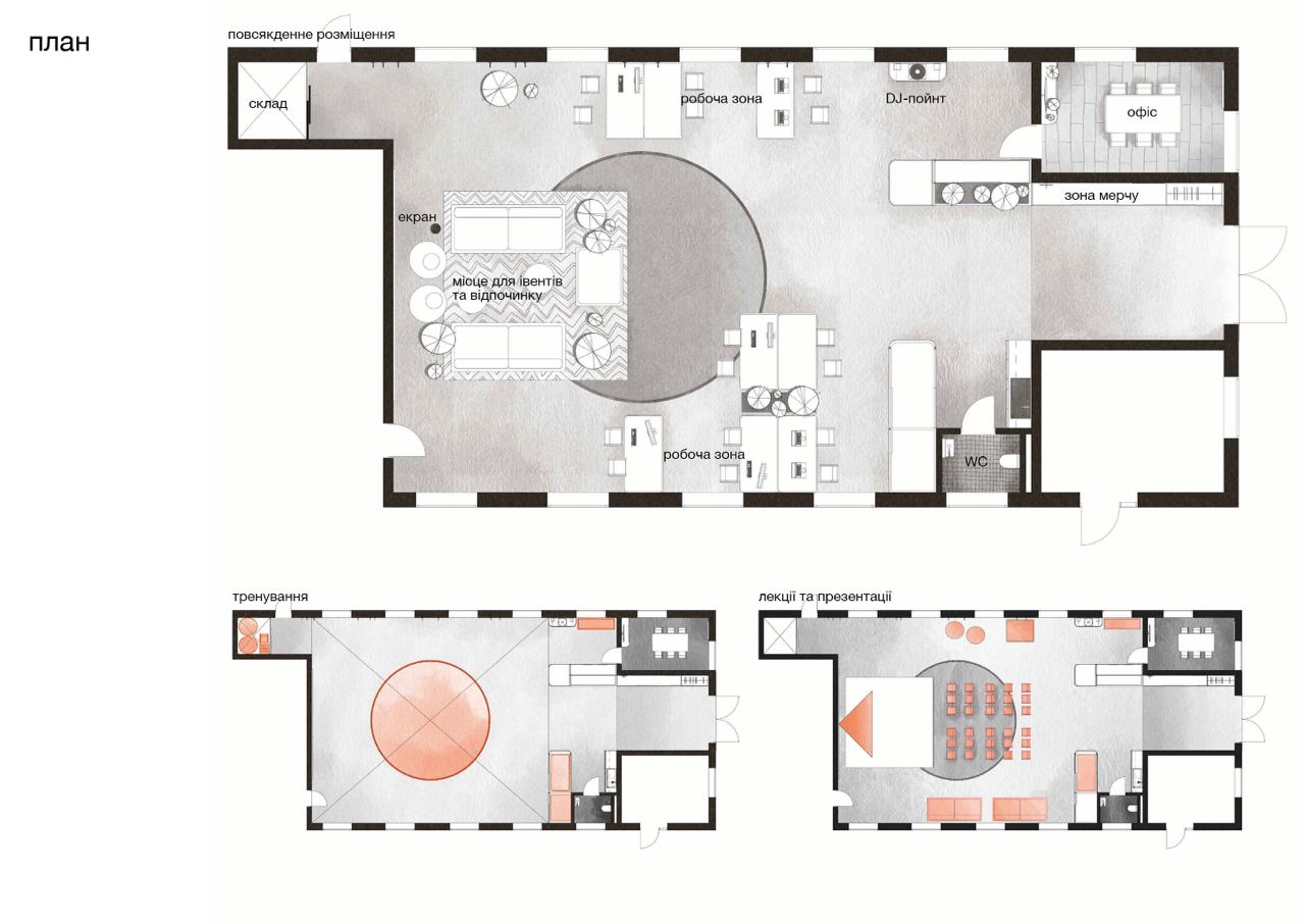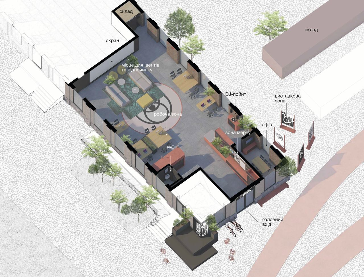 Для нового центру побудують «залу-трансформер», яка зможе підлаштовуватись під потреби конкретного івенту та використовуватись, наприклад, як лекторій, танцювальний спот чи коворкінг.
