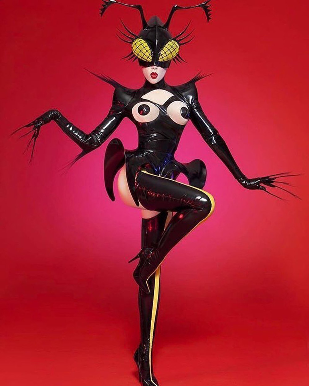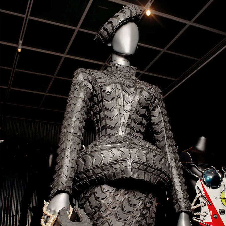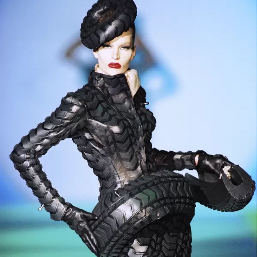 Також для колекції Les Insectes (весна/літо-1997) Мюглер створив костюм з гуми з принтом шин, доповнений шиною-капелюшком.