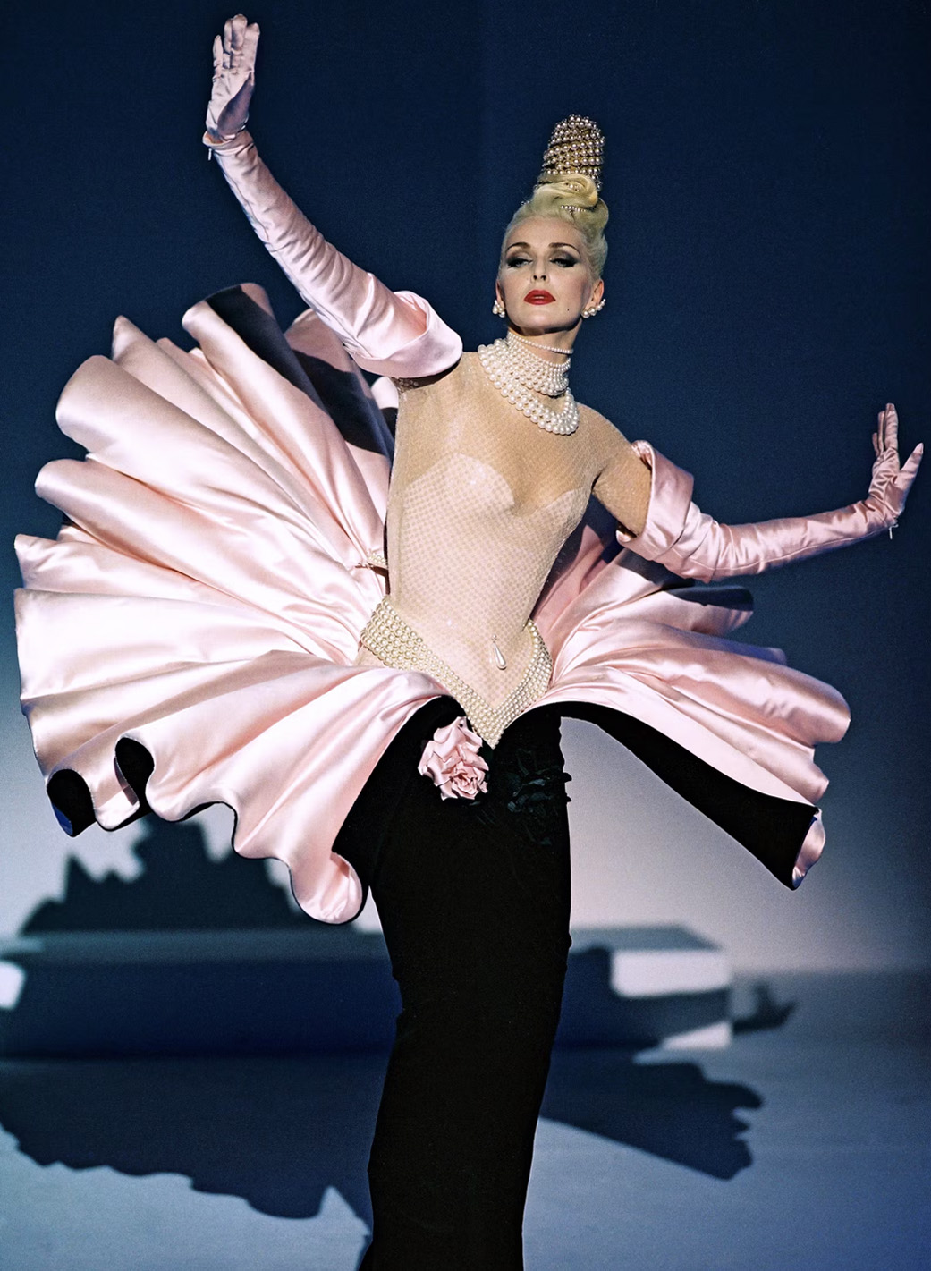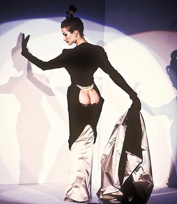 Дизайнер осучаснив давньоримську богиню: за допомогою громіздкої спідниці-мушлі, з якої ніби виринала Венера з сітчастим верхом з нашитою перлиною, що відсилало до популярного в 1990-х пірсингу пупка.