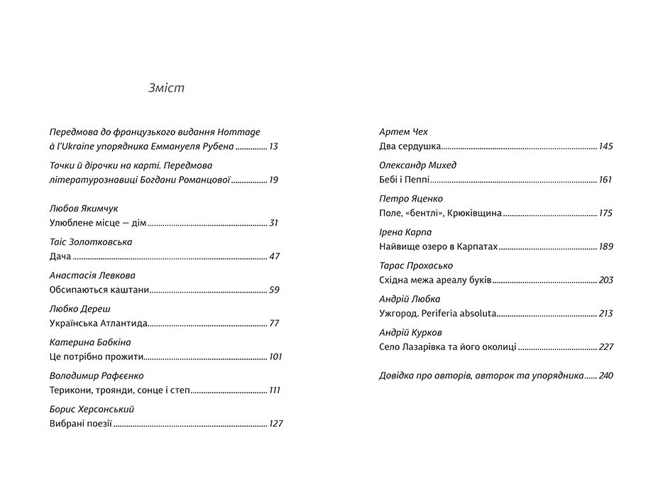 «Катерина Бабкіна розповість нам про Бакоту — затоплене через будівництво дамби село на Тернопільщині. Артем Чех досліджуватиме Полісся, регіон Північної України, де він наразі воює, і розповідатиме про Черкащину. Поет Борис Херсонський згадає Одесу, а Любко Дереш перенесе нас на півострів Трахтемирів на Дніпрі, який називають українською Атлантидою. Анастасія Левкова розповість історію Криму через свідчення, зібрані нею від кримських татар після анексії 2014 року. Петро Яценко намалює портрет Крюківщини, одного з тих багатих міст на західній околиці Києва, які представляли формою української мрії та які у перші дні повномасштабного вторгнення зіткнулися з насильством російського вторгнення», — йдеться в описі книги.
