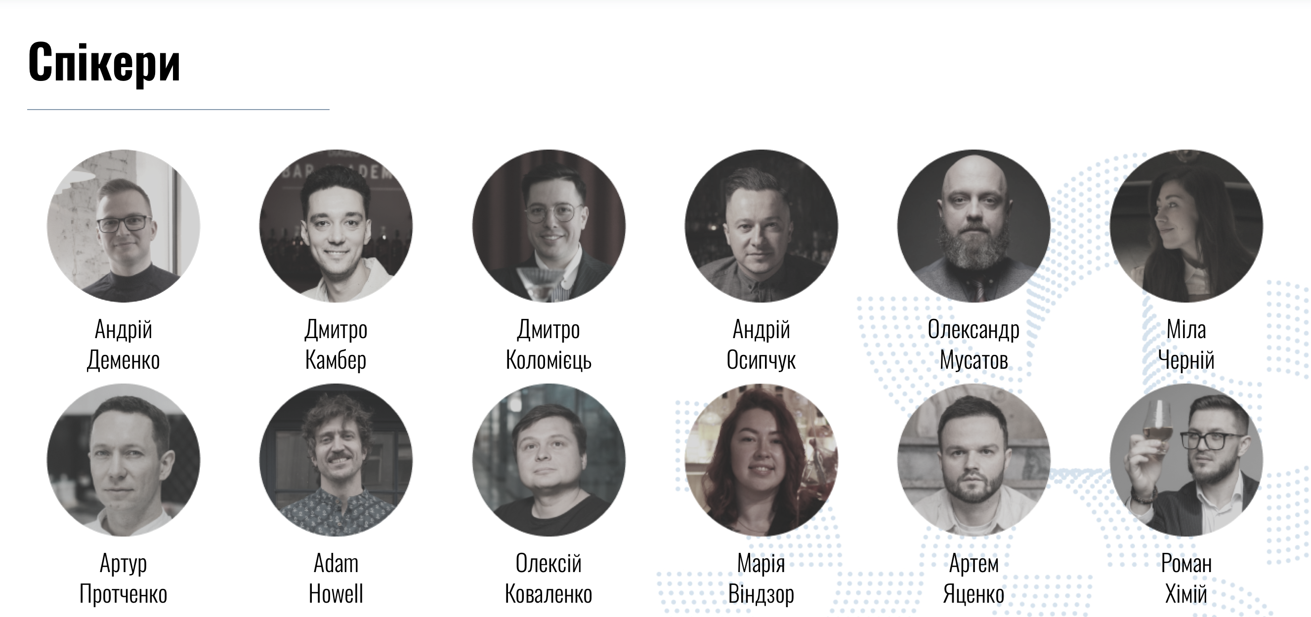 Серед спікерів: барменеджер Zigzag, Kometa та The Naked Bar Андрій Деменко, керівник одеського The Fitz Дмитро Камбер, співвласник True Burger Bar та Hendrick’s Bar Олександр Мусатов, співзасновник за бренд-шеф Podil East Company Адам Говелл, співзасновниця вінницького бару «ПОЛУНОЧНИКИ» та головна редакторка Barout media Міла Черній, бартендер Beatnik Bar Дмитро Кирпичок, Андрій Осипчук — перший та єдиний український бармен у рейтингу топ-10 найкращих барменів світу за версією World Class, а також першовідкривач молекулярної кухні в Україні Артур Протченко та шеф-бармен BarmanDictat Назар Макаров.