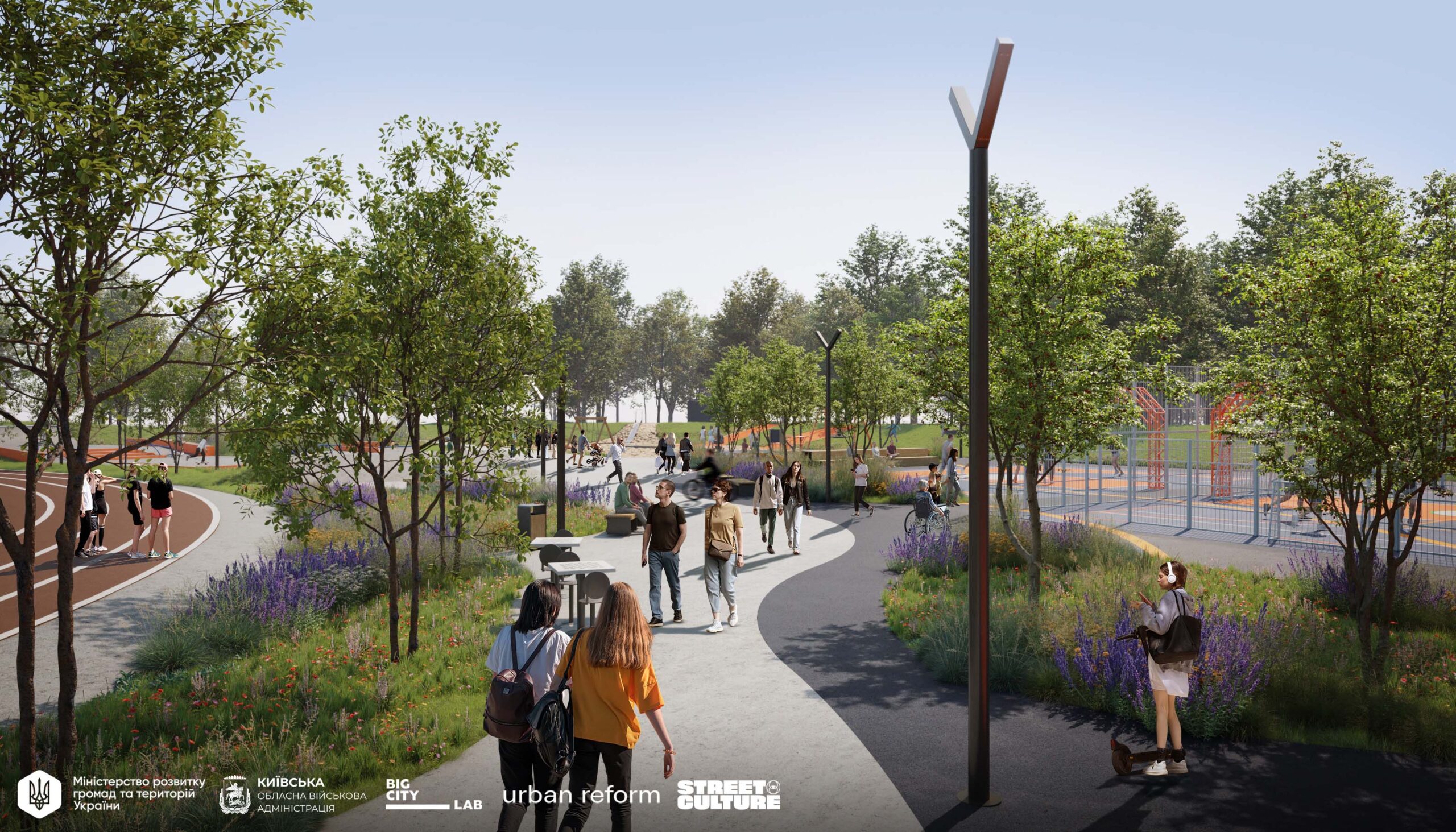 Через весь парк проходитиме стежка з облаштованими місцями для відпочинку. Поруч з більш активною зоною розташують тиху — зелені схили з трибунами.