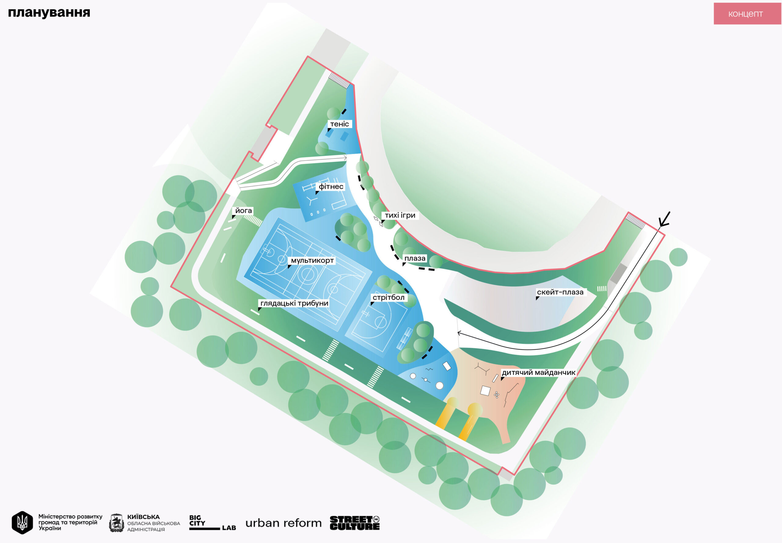 — майданчики для стритболу 3х3, фітнесу та стрит-воркауту, столи для настільного тенісу.
