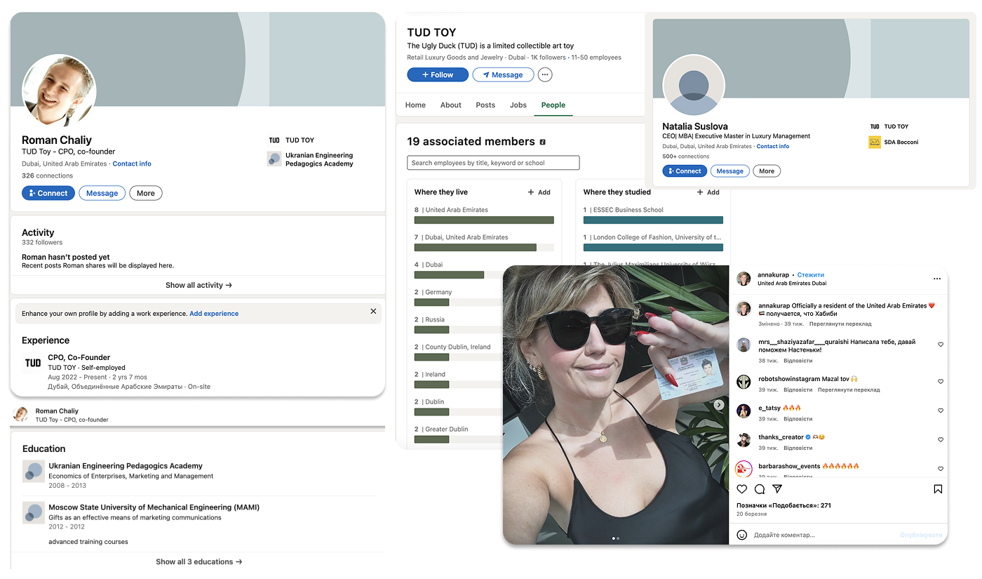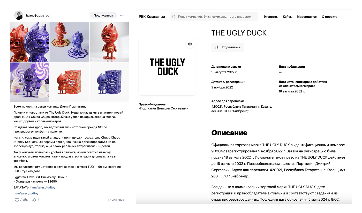 Бренд колекційних артіграшок The Ugly Duck (TUD Toy) позиціонується як дубайський. І співпрацює з іноземними митцями та брендами, відкриває магазини у США, ОАЕ та Південній Кореї, а також бере участь у виставках сучасного мистецтва в Мілані, Парижі, Сеулі. Водночас його співзасновник — блогер і бізнесмен Дмитро Портнягін — їздить на окуповані Росією українські території та фінансує російських військових. А сама The Ugly Duck зареєстрована в Казані й мала досить активний 2024 рік у Москві.