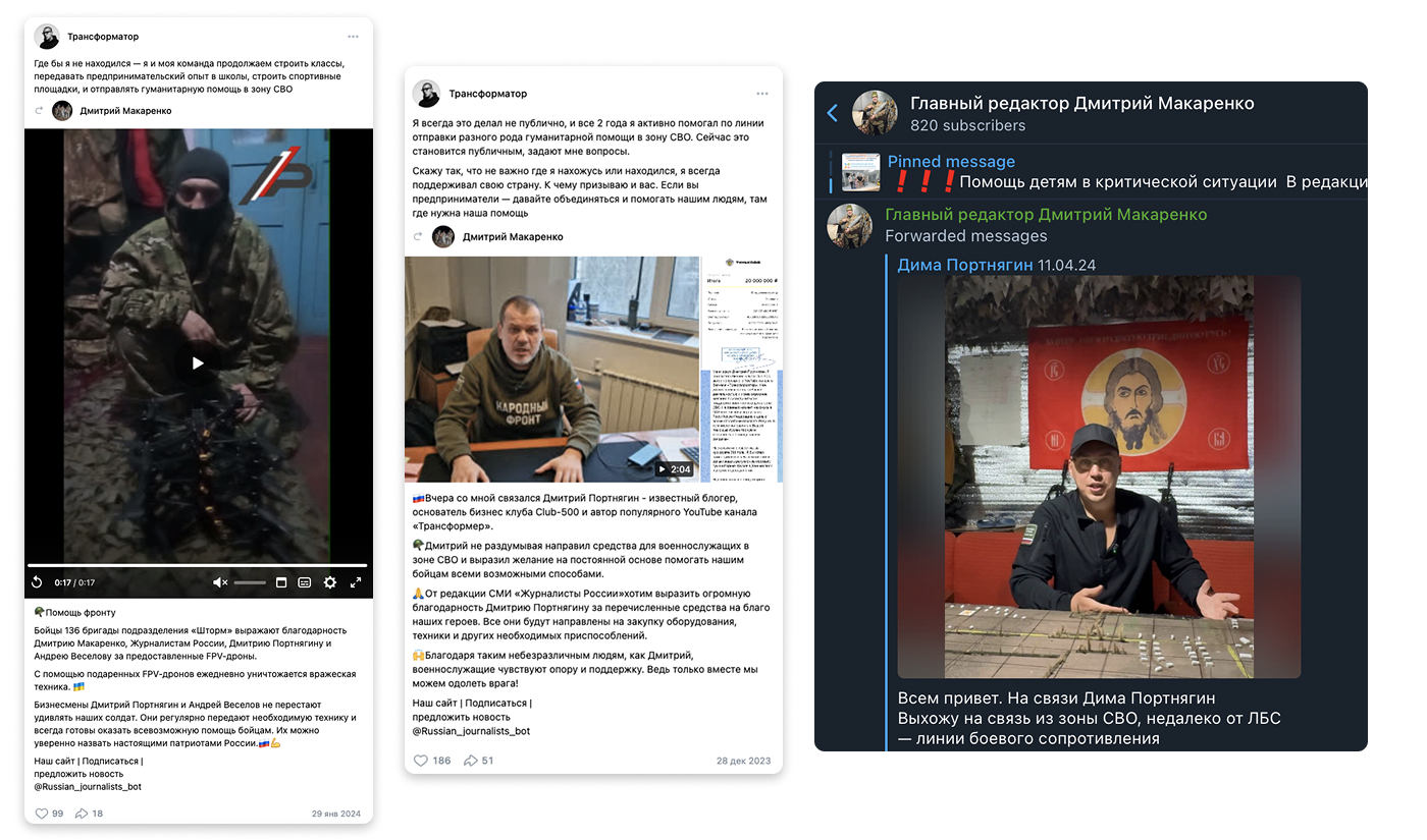 Із грудня 2023 року Дмитро Макаренко почав публікувати пости із подякою Портнягіну за фінансову підтримку російських військових. Макаренко, зокрема, співпрацює із загальноросійським громадським рухом «Народний фронт», який і закуповував потрібне спорядження для російських військових на переказані Портнягіним та Веселовим гроші. DTF Magazine нарахував у телеграм-каналі Макаренка щонайменше 16 повідомлень про перекази коштів від співзасновників Club 500.