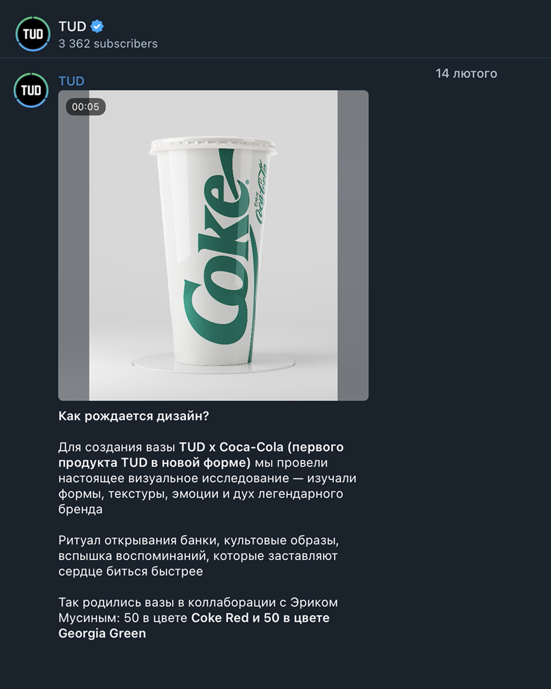 Також у TUD Toy є російський сайт та телеграм-канал (понад три тисячі підписників), де публікують новини бренду, зокрема і про виставки та проєкти в Росії. Наприклад, лише в телеграм-каналі розповіли про колаборацію з московським художником Еріком Мусіним, який створив вази у формі склянок Coca-Cola. Щоправда, достеменно невідомо, чи це офіційна колаборація з американським брендом (а на наш запит також не було отримано відповіді), і чи є вона частиною співпраці TUD Toy (з огляду на реліз TUD Toy і Coca-Cola, представлений у грудні 2024 року), адже в офіційних соцмережах Coca-Cola згадки про це немає, а художник часто обігрує у своїх роботах логотипи брендів.