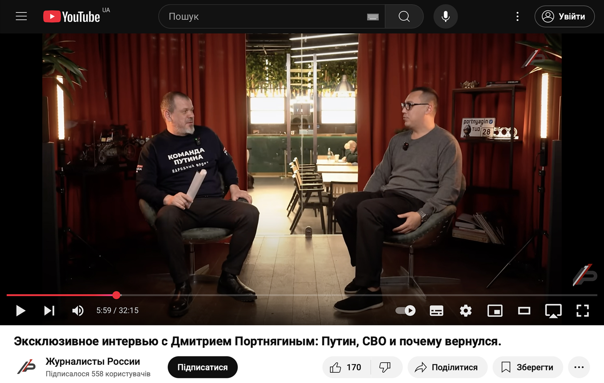 У березні 2024 року на пропагандистському каналі «Журналісти Росії» вийшло інтерв’ю із Дмитром Портнягіним. Портнягін сидів на фоні таблички «Portnyagin TUD» із зображенням чорної фігурки качки, а поруч із ним — головний редактор і член «Команди путіна» і «Народного фронту» Дмитро Макаренко. Вони обговорювали, зокрема, і те, що Портнягін вирішив долучитися до «Народного фронту», щоб допомагати російським окупантам.