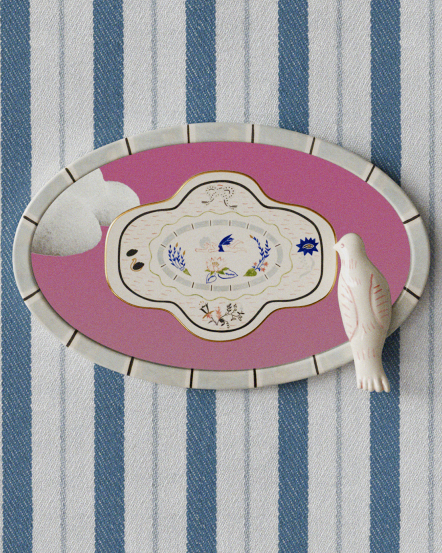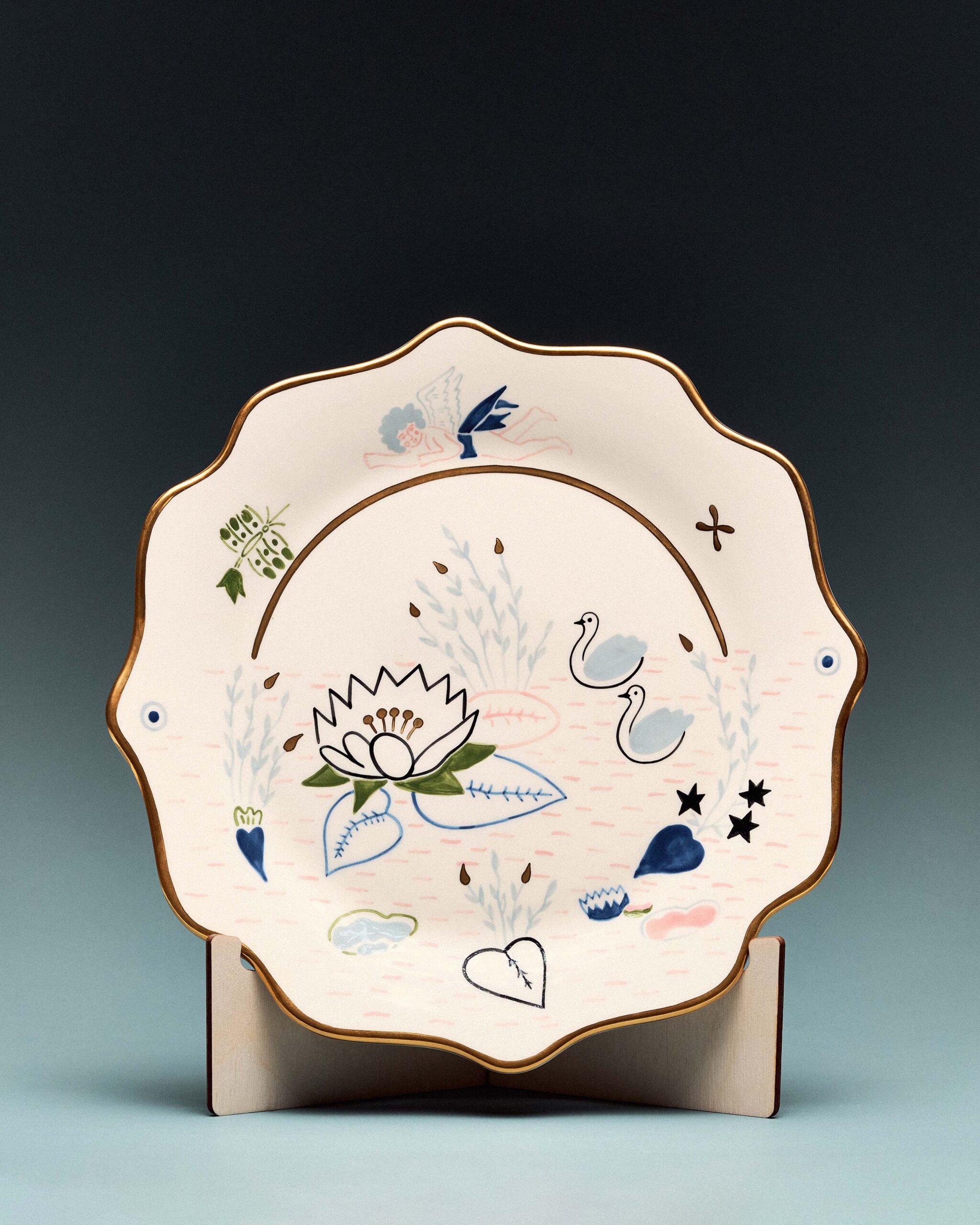 Так до колекції увійшли вишиті сорочки, жилетки, сукні, топи-хустки, спідниці, штани-шаровари та шовкові хустки. Кераміка представлена на виставці чашками та тарілками з візерунками, цукорницями та свічками.