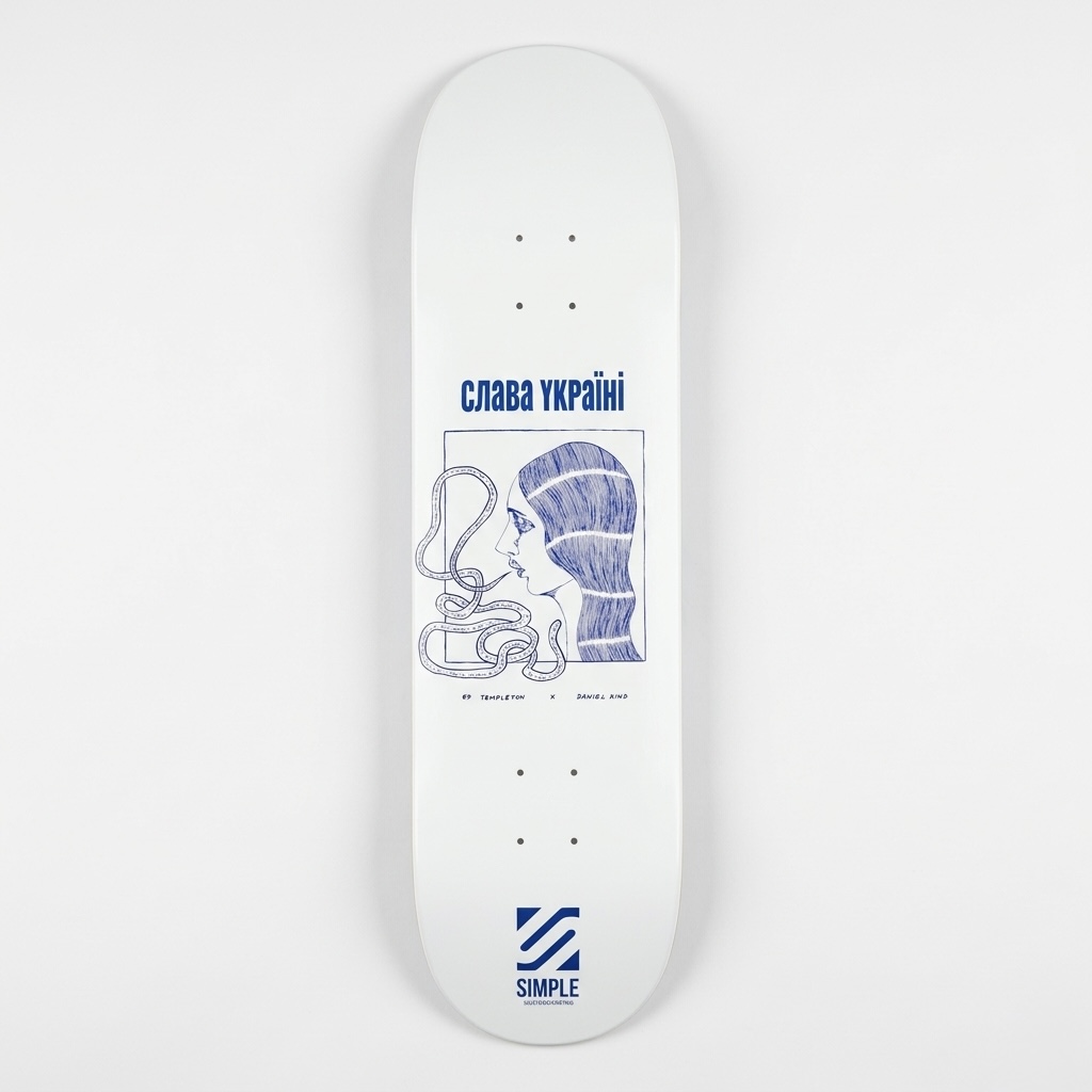 Основою дропу Simple Skateboarding стали принти з колекції Кінга 2023 року: на білі дошки нанесли синю ілюстрацію жінки зі змією та написом «Слава Україні» й фотографію хлопця та дівчини, які цілуються.