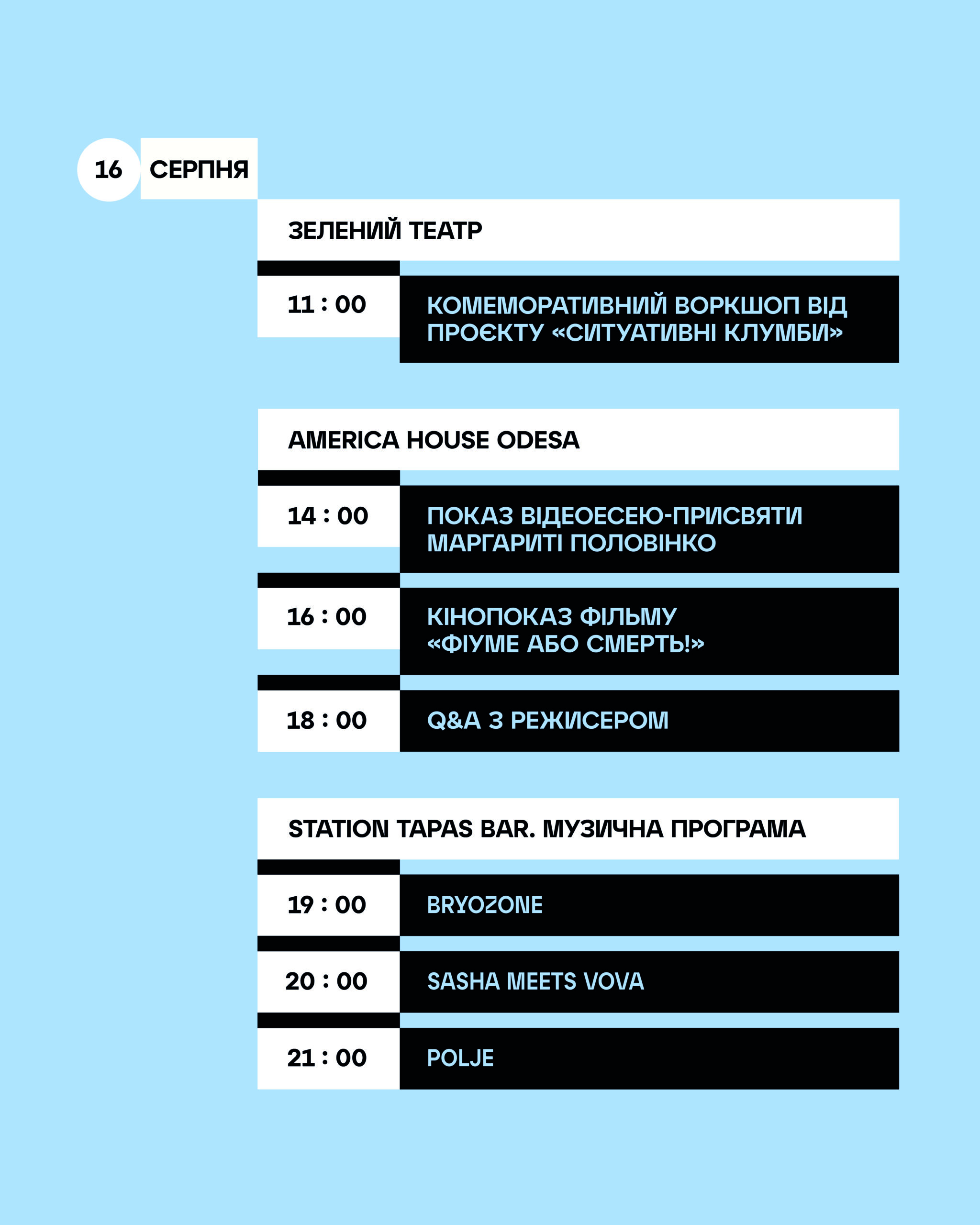 У програмі фестивалю заплановані покази документального кіно, музика, комеморативний воркшоп та розмови про пам’ять, спільноту та взаємну турботу. Подія проходитиме на двох локаціях: America House Odesa (вул. Грецька, 1а) та Station tapas bar (вул. Канатна, 6).