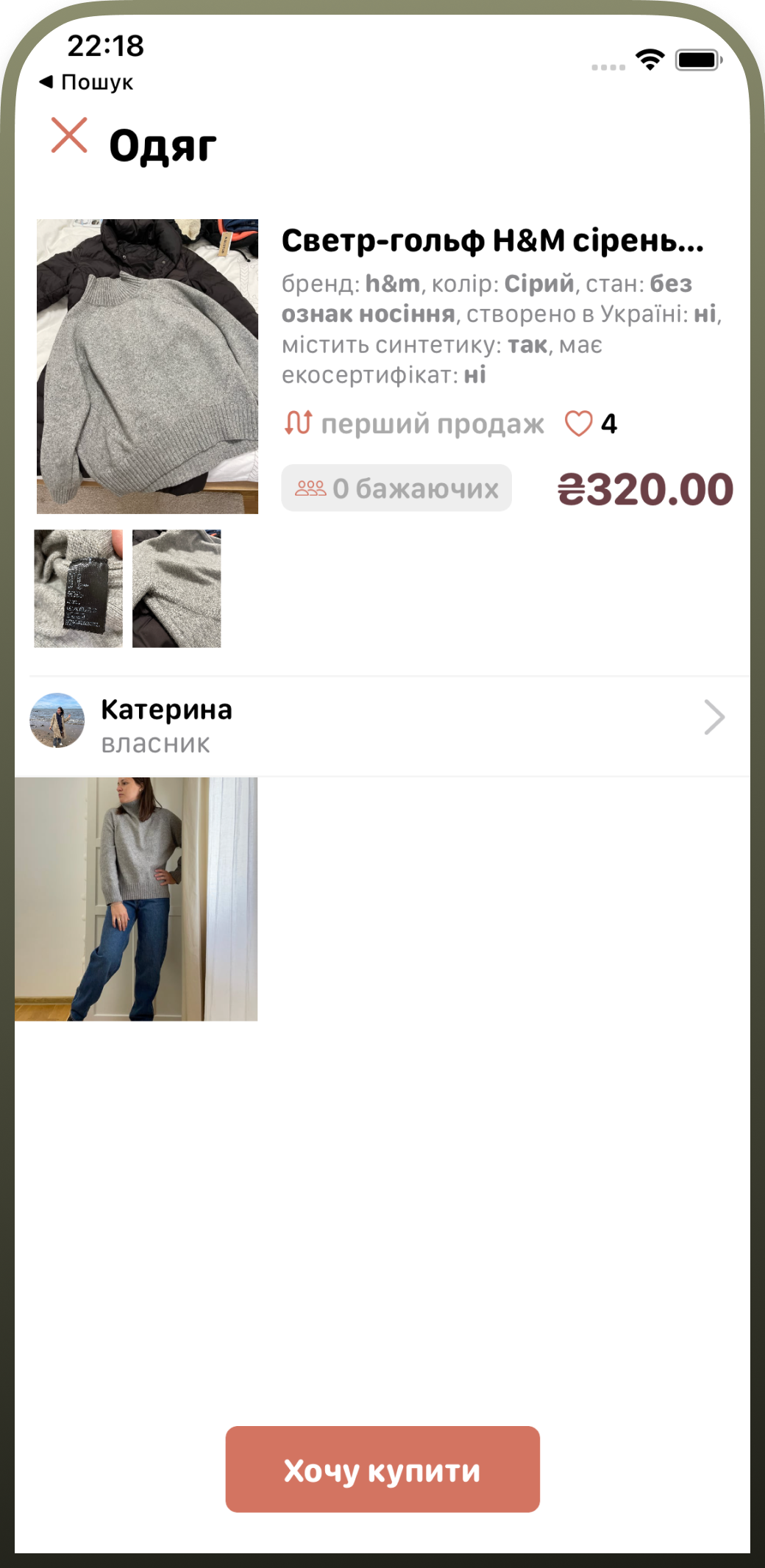 Самі ж речі у профілі показані як каталог. Продавці можуть вказати всі необхідні дані про річ: бренд, колір, стан, країну виготовлення, опис, вартість та наявність сертифіката екологічності.