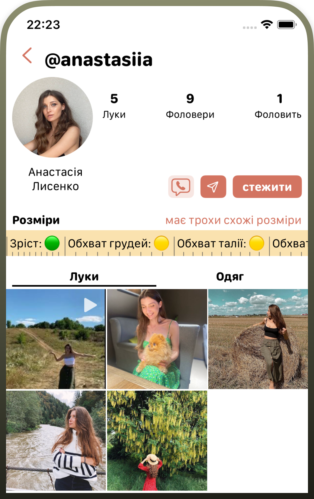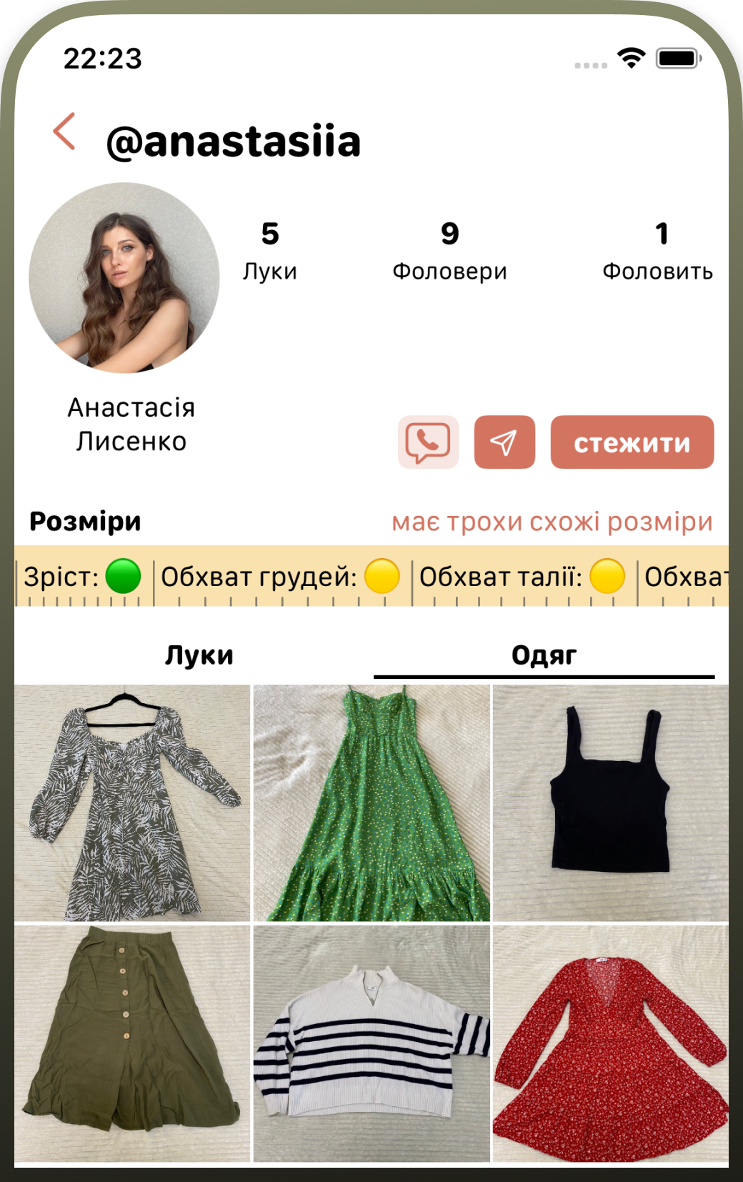 Акаунти продавців також представлені у форматі профілю користувача в інстаграмі: поруч з іменем і фотографією людини показана загальна кількість товарів на Swapp, зріст та мірки попереднього власника речі, а також кількість підписників та підписок.
