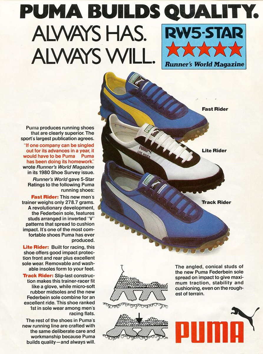 Fast Rider були одними з перших стильних і практичних кросівок зі спеціально розробленою підошвою, яка амортизує і має краще зчеплення. Завдяки легкій верхній частині і агресивній підошві Federbein, що стійка до ударів. До того ж, вони важили близько 280 грамів. «Ці характеристики роблять Fast Rider ідеальними кросівками для бігу по пересіченій місцевості і по дорозі», — йшлося в описі в каталозі.