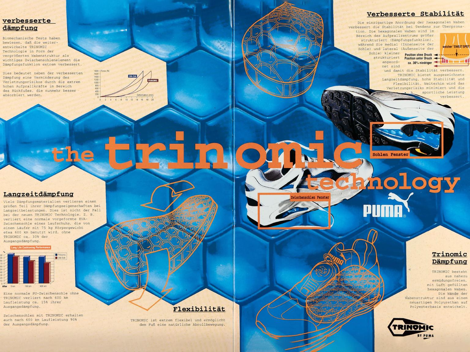 На той час, як зазначають у PUMA, найдосконаліша амортизаційна система — TRINOMIC. Її суть — в шестикутній системі підошві, що складається з прозорих комірок, які забезпечували амортизацію, гнучкість і стабільність. Окрім бігових моделей, технологію також використовували у баскетбольних, тенісних та футбольних кросівках.