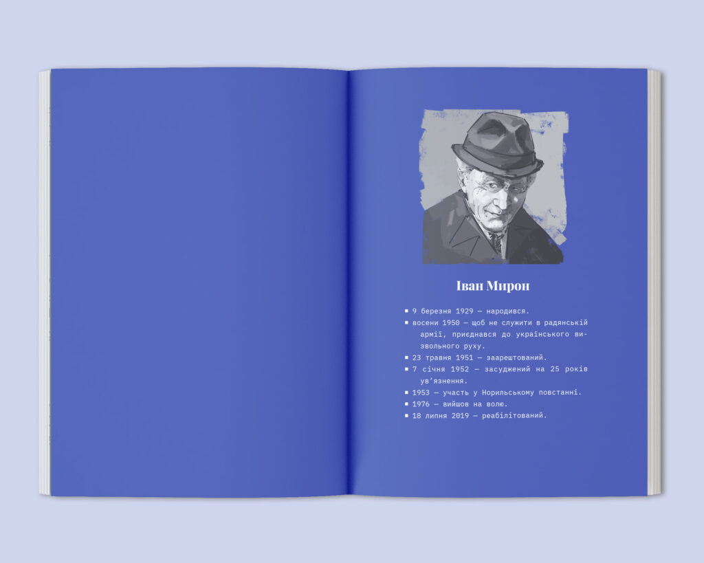 Серед героїв книги — літературознавець і поет Іван Світличний, ОУНівець, учасник повстання політв’язнів в Норильську Іван Мирон, звʼязкова Романа Шухевича Дарія Гусяк, один із лідерів кримськотатарського національного руху, правозахисник Мустафа Джемілєв, член ОУН, організатор руху спротиву в’язнів «ОУН-Північ» Михайло Сорока, правозахисник і політик Степан Хмара, зв’язкова Романа Шухевича, організаторка і керівниця Українського Червоного Хреста Катерина Зарицька та інші.