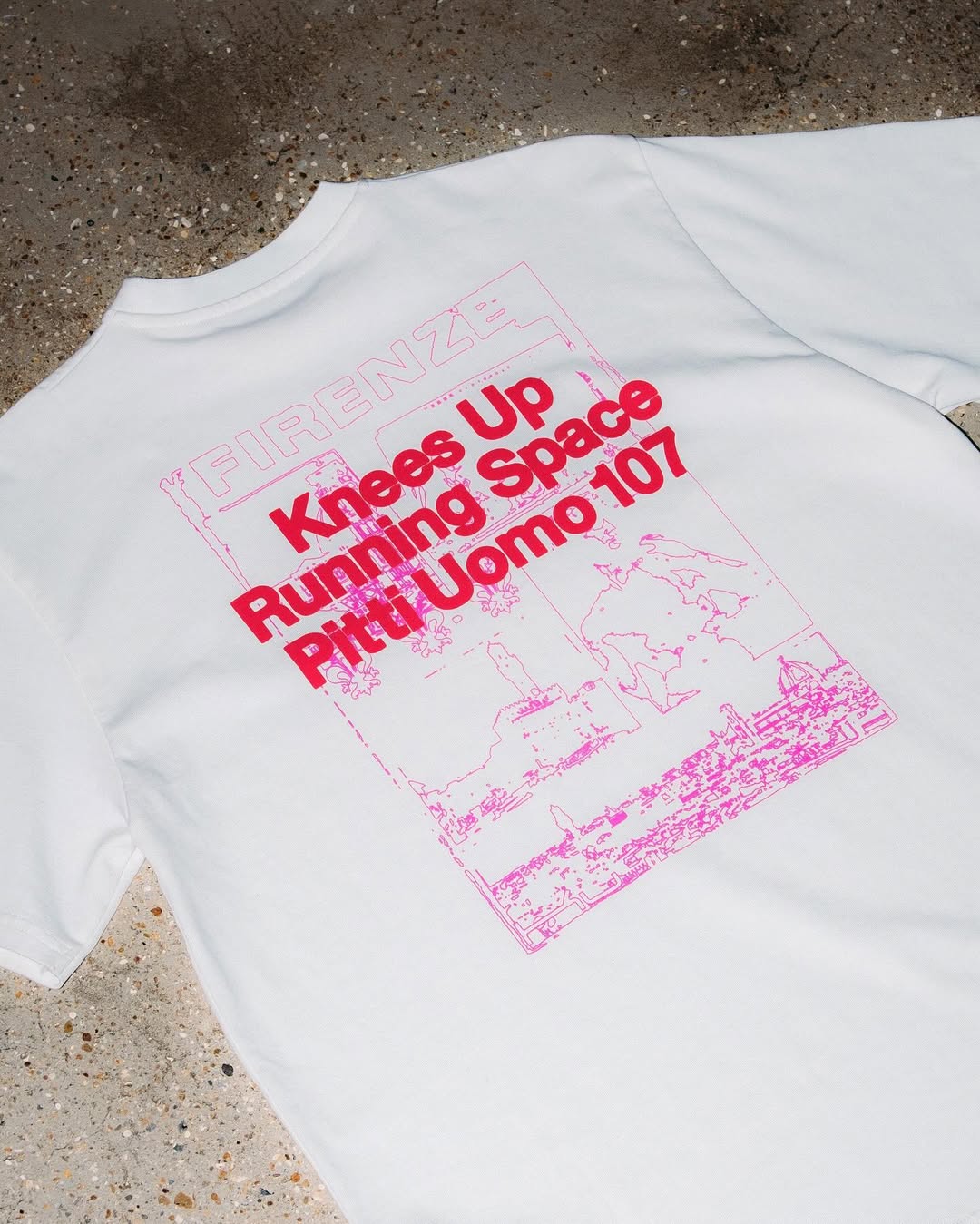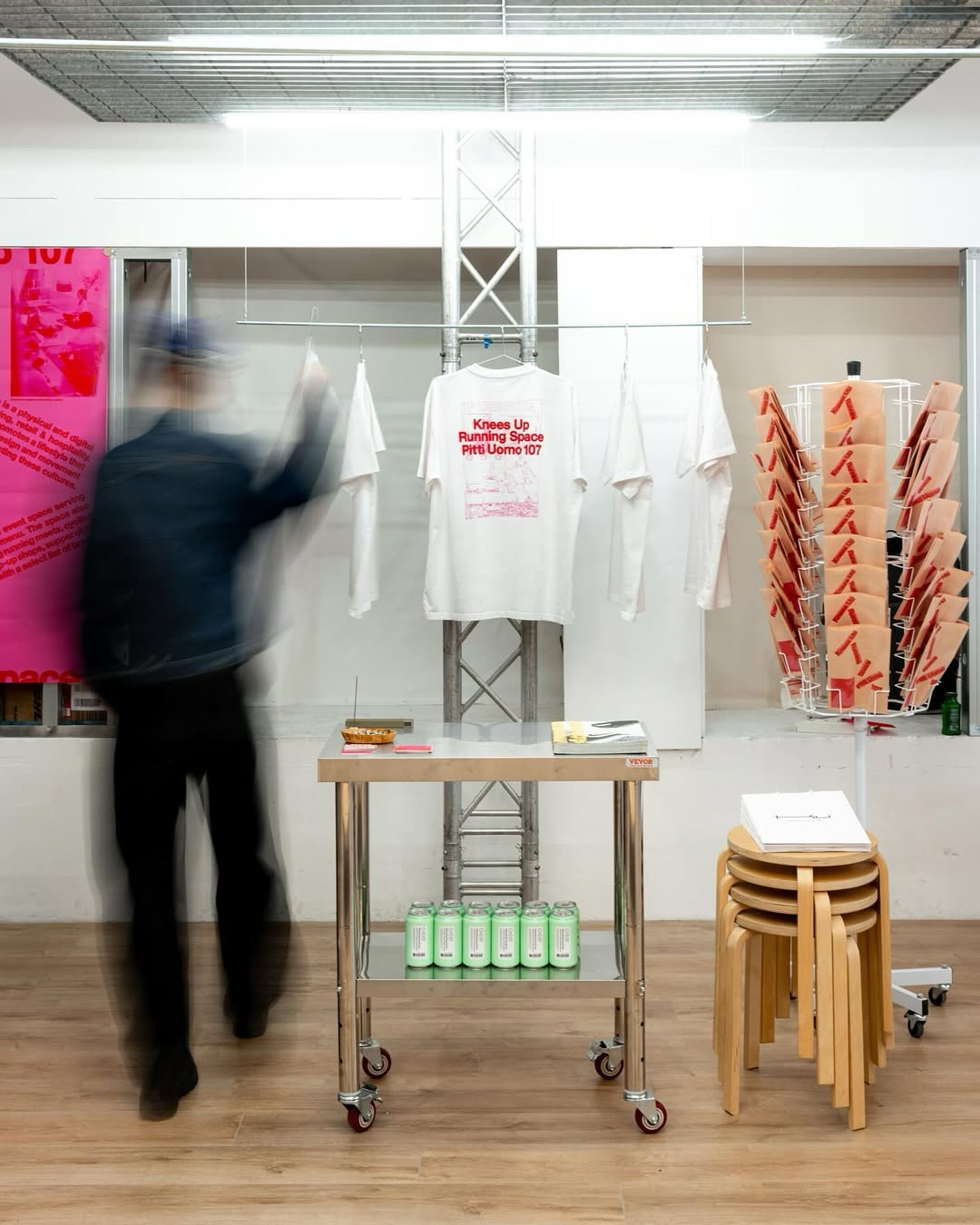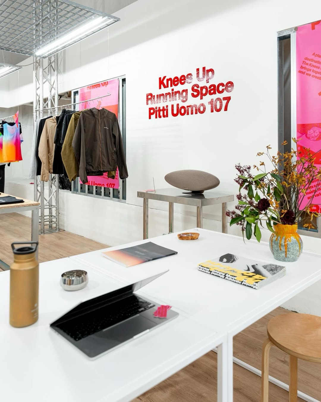 На Pitti Uomo представили спеціальний простір Knees Up Running Space, розроблений у партнерстві з лондонцями Меттом Горроксом та Олівером Гусоном, засновниками Knees Up — бігової спільноти та багатофункціонального простору. Місце, у якому поєднали офіс, точку збору спільноти, кав’ярню та пекарню, відкрили в березні 2024 року. Knees Up став домівкою для кількох партнерств та активацій брендів, серед яких adidas, On, Hoka та інші, а також вітриною для інді-брендів спортивного одягу.