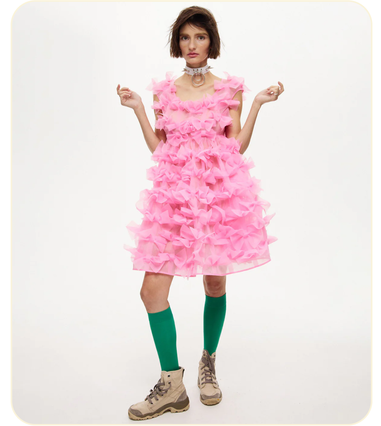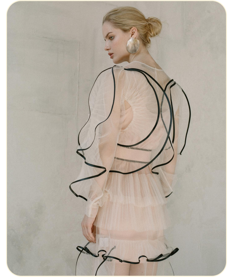 Nadya Dzyak спеціалізується на архітектурних речах, у яких простежується ілюзія невагомості та оптичні ефекти завдяки напівпрозорим тканинам. Наприклад, ця сукня пошита з напівпрозорої тканини і доповнена багатошаровими плісированими оборками та воланами, обробленими чорним кантом — останній, власне, і утворює ілюзію контурів.