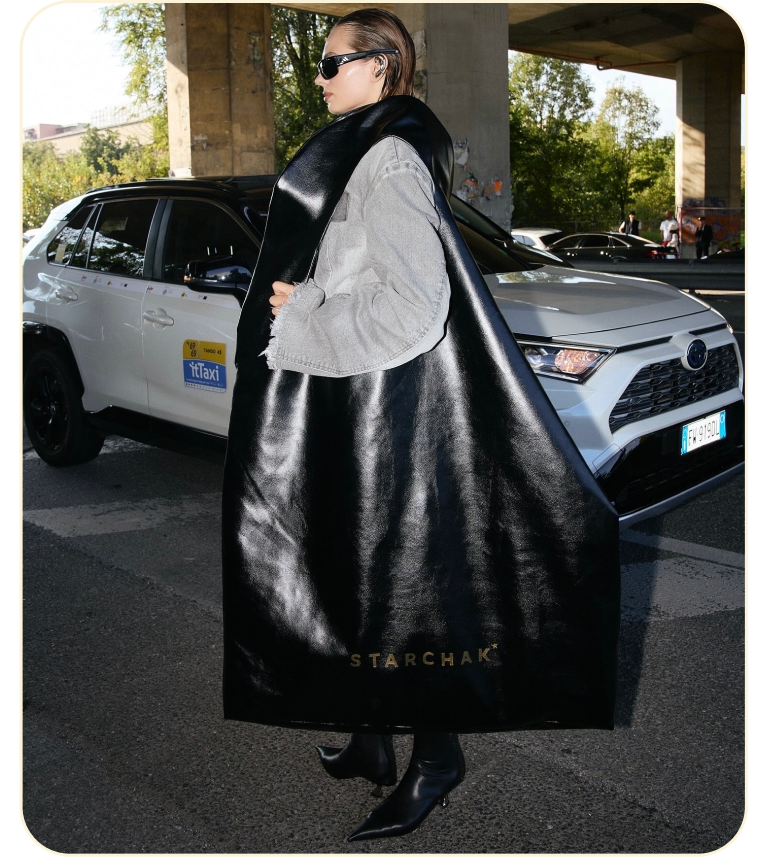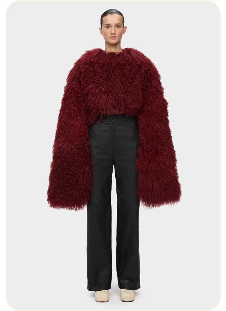 Бренд шкіряного одягу переосмислює класичні силуети. Цього разу Артур Кулаковський додав об’єму короткому кейпу завдяки матеріалу — хутру лами.