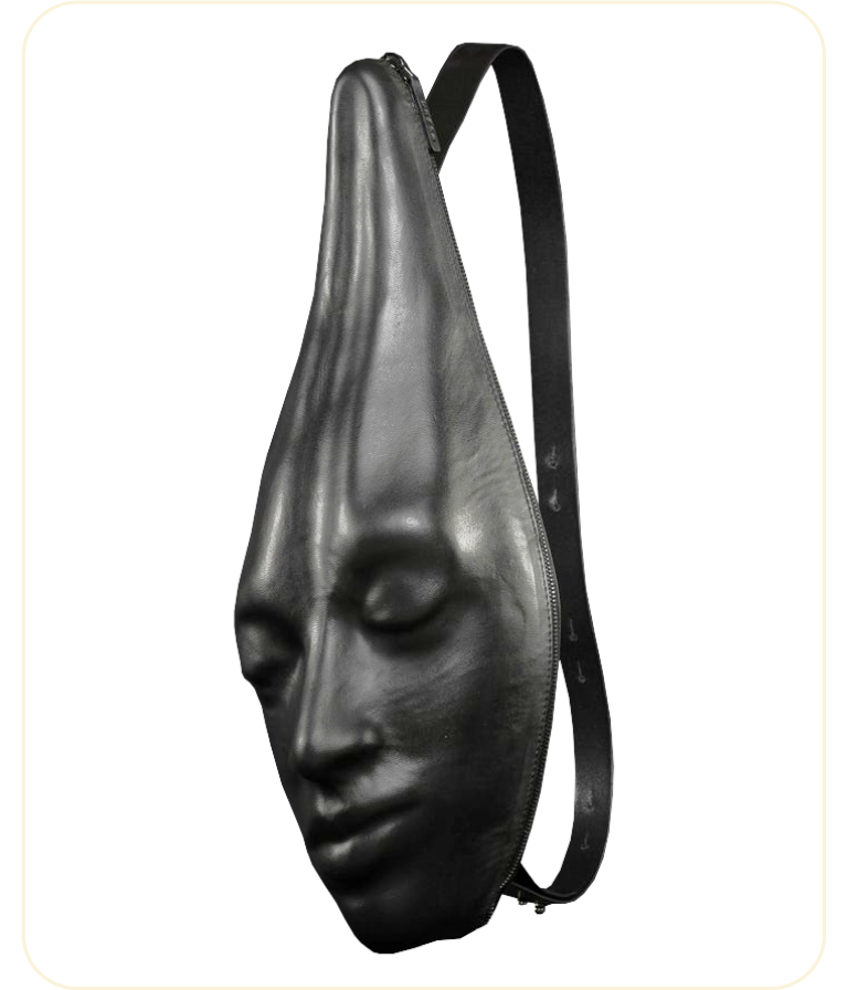 «Скульптури, які можна носити», — так описують концепцію бренду Kofta Studio. Наприклад, цей рюкзак має форму скульптури обличчя. Він виконаний зі шкіри, доповнений однією лямкою та важить 425 грамів.