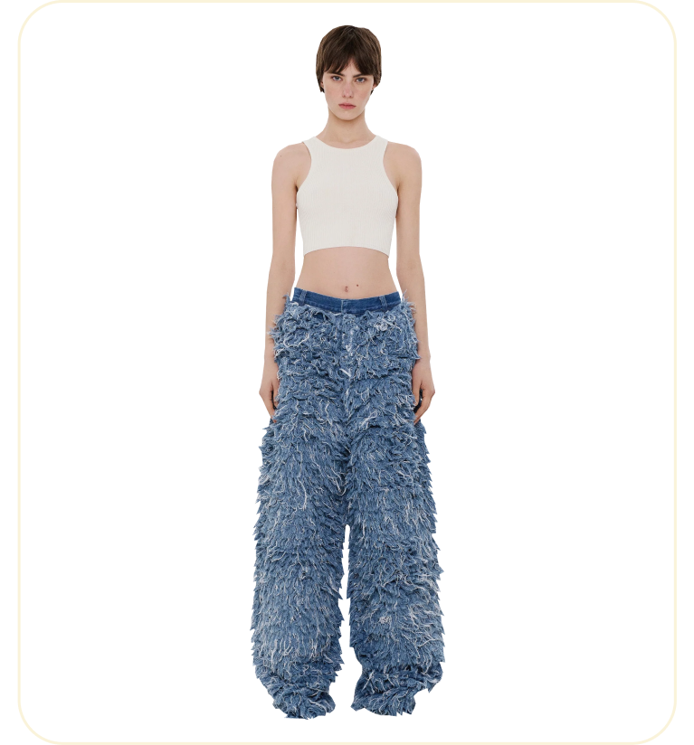 Одна з найцікавіших розробок KSENIASCHNAIDER — хутро з деніму, з якого бренд шиє взуття, куртки і, звісно, джинси. Останні цього року отримали нагороду Peta Vegan Awards за демонстрацію того, що «сталі та веганські фешен-рішення можливі в будь-який час». Джинси мають назву Chewbacca, бо іронія — ще один важливий меседж, закладений у ДНК бренду.
