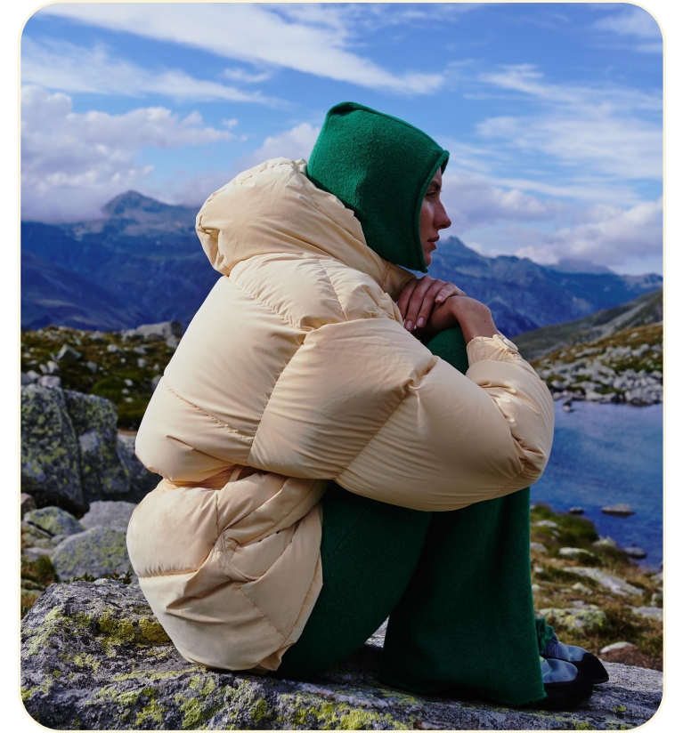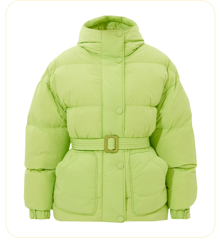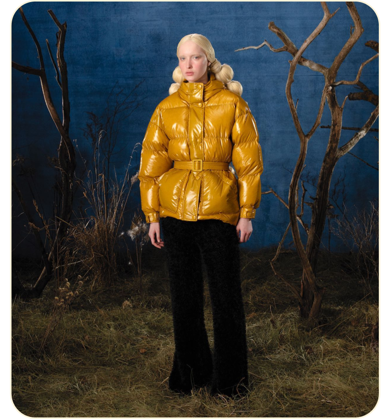 Силует цього пуховика натхненний образом мішленівської людини, проте переосмислений завдяки поясу, який утворює силует пісочного годинника. Куртки випускають як у спокійних кольорах — чорному, хакі — так і неонових, блискучих, «з ефектом фольги». У 2019 році, коли і придумали пуховик, випустили 24 колірні варіації.