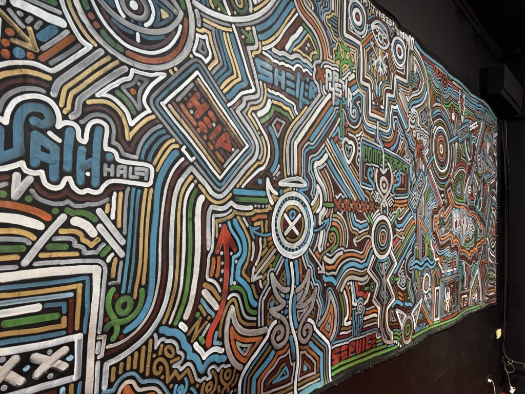 «Це останнє чисте полотно, яке я придбав перед початком повномасштабки і над яким працював в окупації, — згадує Максим. — Згодом я провіз його через півтора десятка російських блокпостів. Повісив тут, бо воно прикольно і візуально, і концептуально. Для мене це також артефакт війни».