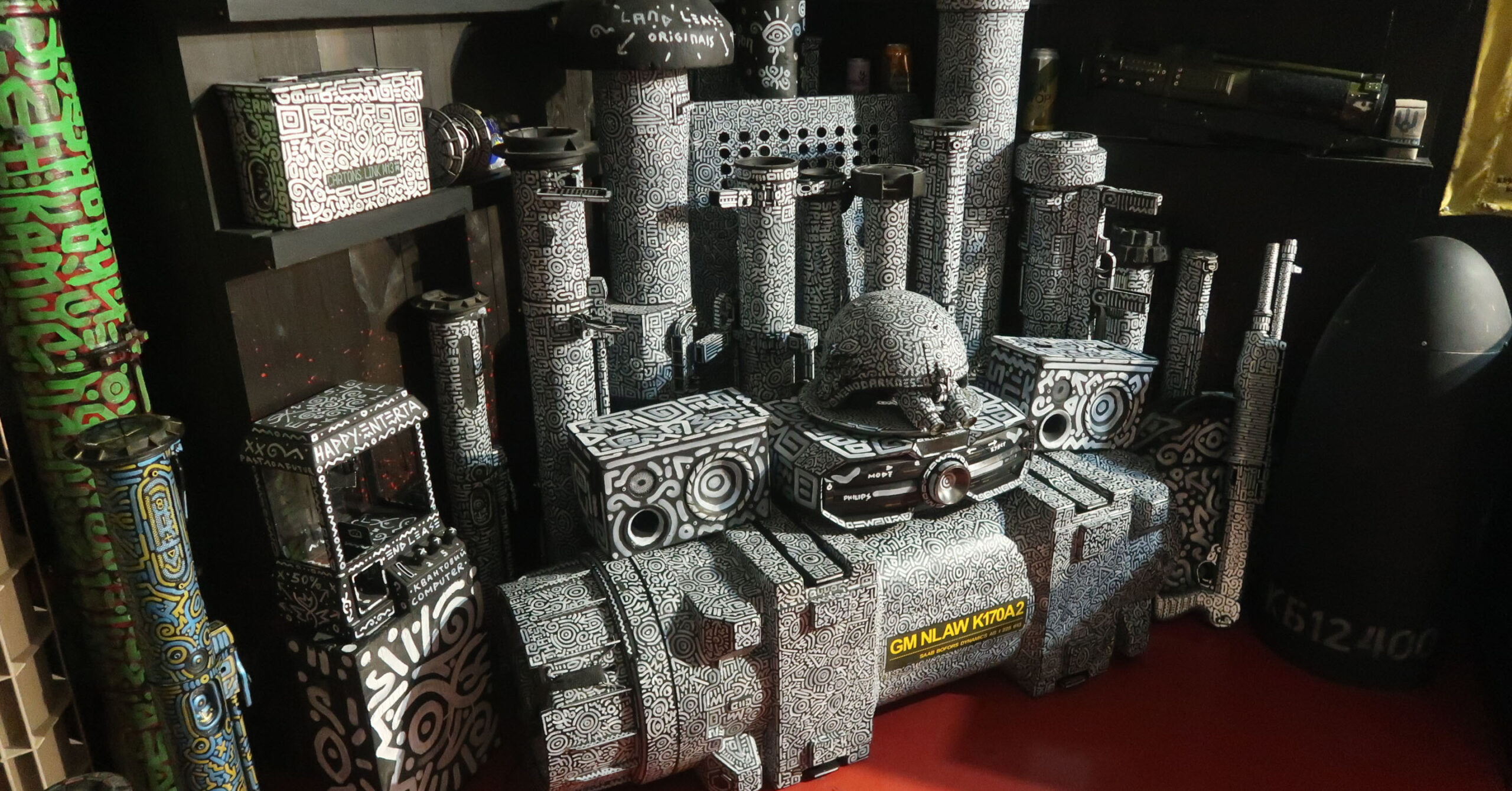 Коли Кільдеров у 2023 році організовував свою першу київську виставку в галереї «Лавра», він уже мав «трохи брухту». Зокрема, використані тубуси РПГ, які збирав для розпису. Один з таких тубусів він розмалював написом Art Force, і це стало його першим «об’єктом війни».