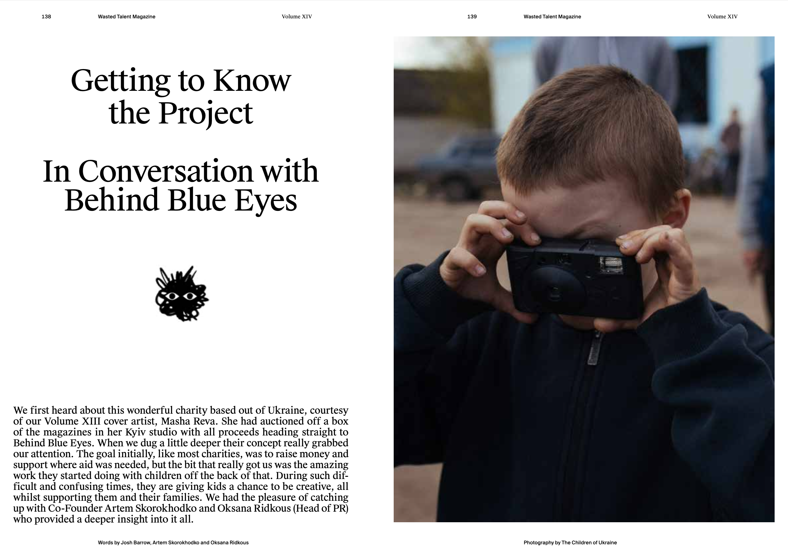 Журнал про сучасну культуру, екшен-спорт та субкультури Wasted Talent представив 14 друкований випуск — один з матеріалів номера присвячений проєкту Behind Blue Eyes, який працює з дітьми з деокупованих та прифронтових міст України. У журналі розповіли історію проєкту — від моменту заснування з метою гуманітарної допомоги дітям та їхнім родинам до еволюції у проєкт з підтримки та розвитку дитячої творчості на їхнього власного досвіду життя у воєнні часи. Ми поговорили з командою Behind Blue Eyes та розповідаємо докладніше про їхню колаборацію з Wasted Talent