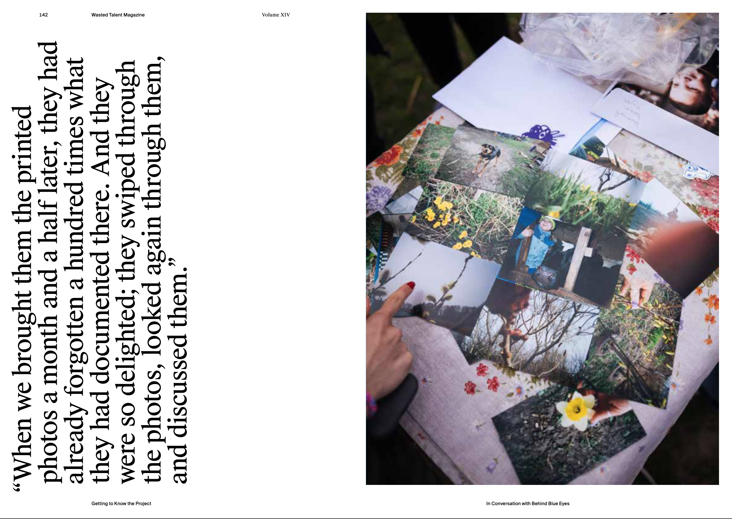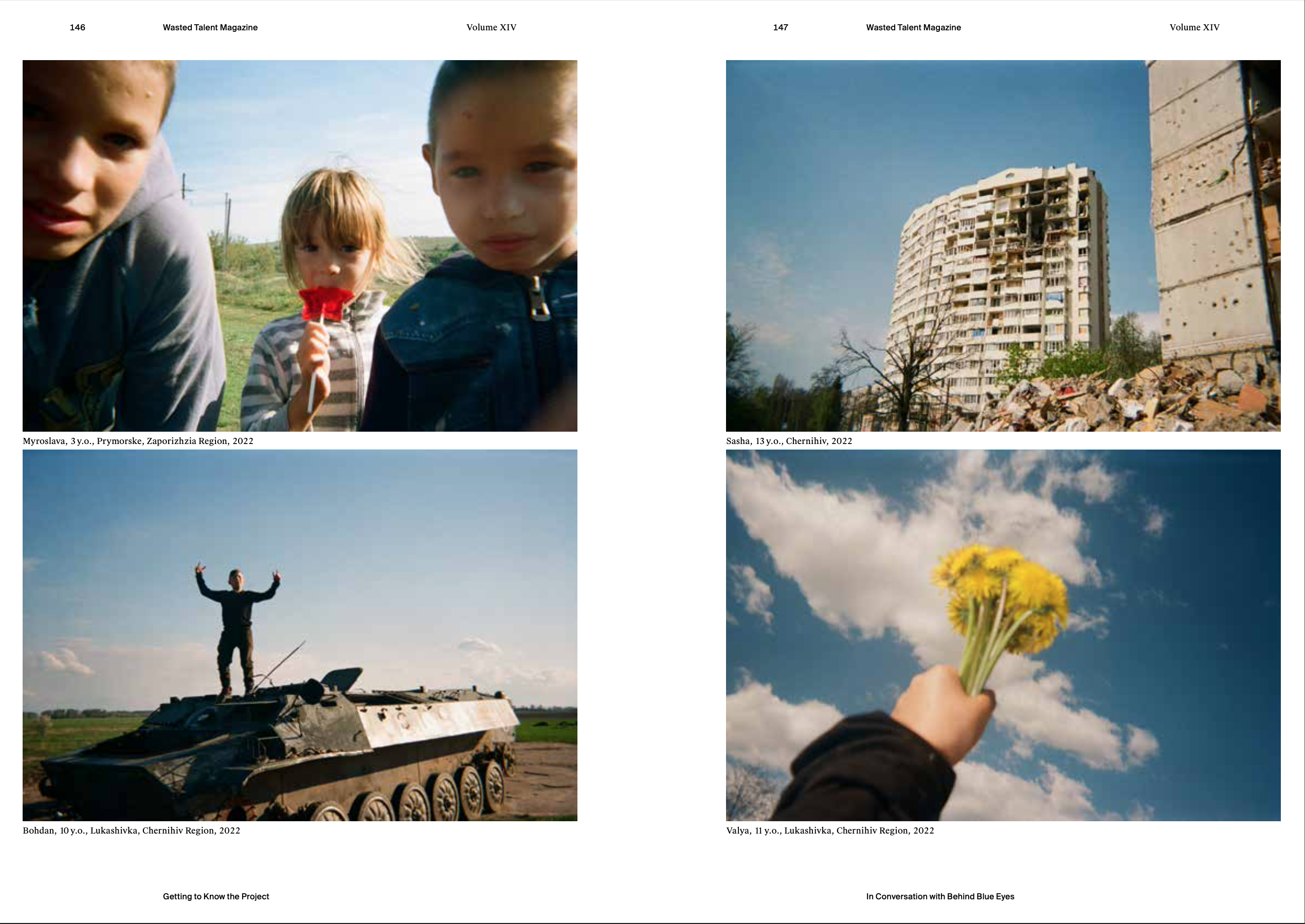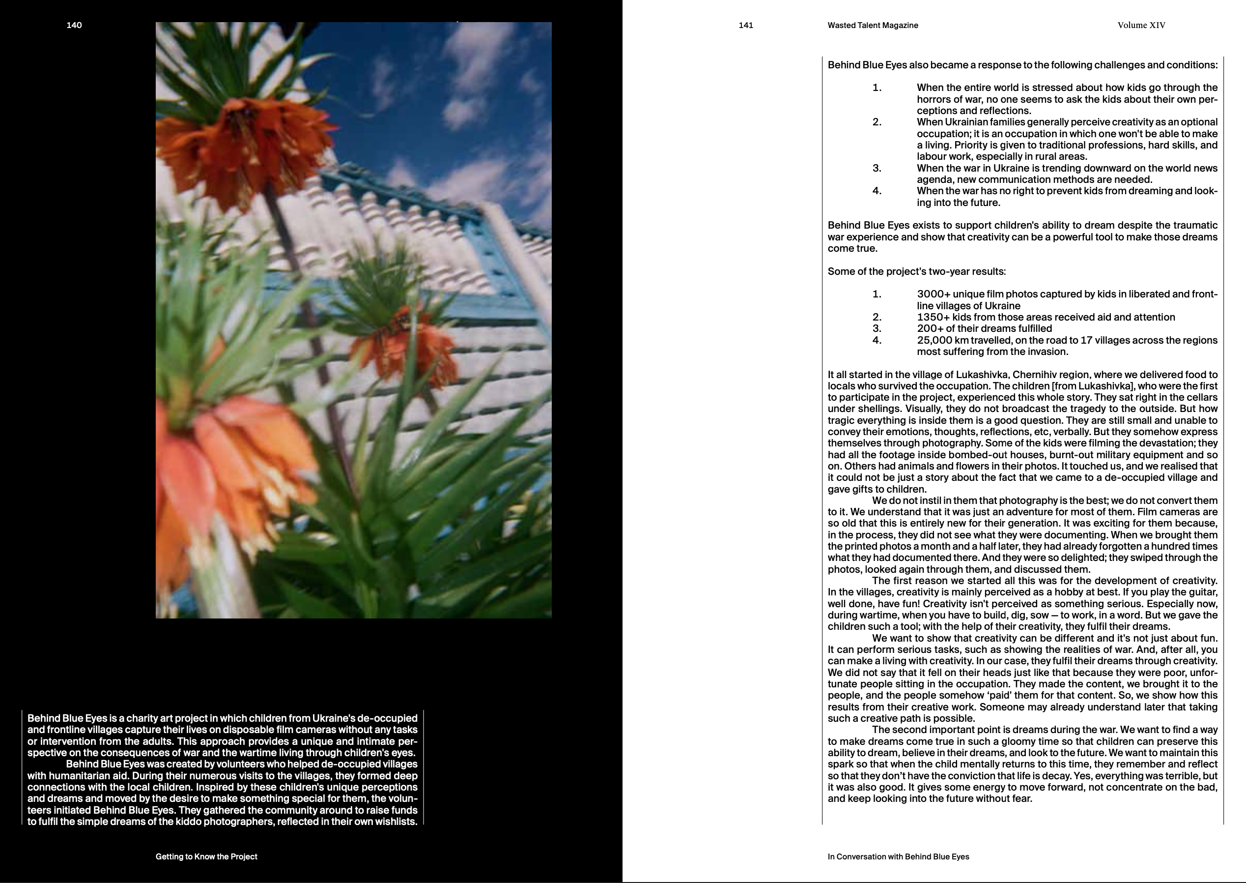 «Для нас будь-які медійні прояви — це можливість показати творчість дітей та їхній погляд на життя. Їхні світлини — це ж своєрідний формат воєнної фотодокументалістики, отже, ще один спосіб привернути увагу світу до війни в Україні. Особливо приємно, що редактор видання запропонував розмістити у статті QR-code на наш сайт, аби читачі Wasted Talent могли підтримати проєкт».Скороходько додав, що редактор Wasted Talent Джош Барроу, який працював над матеріалом, «був у цілковитому захваті від дитячих фото», тому на сторінках журналу розмістили усі знимки, якими поділилась з редакцією команда Behind Blue Eyes.